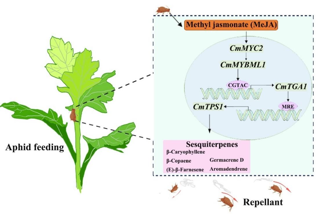 研究进一步鉴定出调控CmTPS1的上游转录因子CmTGA1。CmTGA1在蚜虫取食和茉莉酸甲酯(MeJA)诱导下表达,能够直接结合CmTPS1启动子上的CGTCA元件并激活其转录。改变CmTGA1的表达水平显著影响了菊花中倍半萜类化合物的含量以及对蚜虫的驱避效果。随后,研究发现MYB类转录因子CmMYBML1是CmTGA1的上游调控因子。CmMYBML1同样在蚜虫取食和MeJA诱导下表达,直接结合CmTGA1启动子上的MRE元件并激活其表达。CmMYBML1的过表达增强了CmTGA1和CmTPS1的表达,并提高了对蚜虫的驱避性。