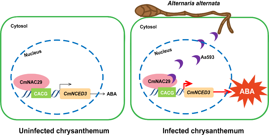 近期,菊花遗传与种质创新团队在国际植物学知名期刊Plant Biotechnology Journal在线发表题为“Alternaria alternata Effector Aa593 Promotes Virulence by Hijacking the CmNAC29-Mediated Abscisic Acid Biosynthesis Pathway in Chrysanthemum”的研究论文,揭示了菊花链格孢黑斑病菌效应子Aa593通过劫持寄主CmNAC29介导的脱落酸(ABA)生物合成途径来促进其毒力的新机制。