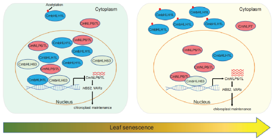 本研究揭示了一个以CmbHLH63为核心的分子调控模块,该模块通过CmbHLH63与转录抑制因子CmbHLH1L及转录激活因子CmNLP6/7L之间的竞争性相互作用进行调控,并受到CmbHLH1L乙酰化介导的核质穿梭的调节,从而精确控制下游基因的表达和叶片衰老进程。这一发现为深入理解植物叶片衰老的调控网络提供了新的视角。团队在读博士研究生杨玉娜和已毕业硕士钱紫燕为论文共同第一作者,陈素梅教授和王利凯教授为论文共同通讯作者。团队蒋甲福教授和陈发棣教授,以及美国德克萨斯大学奥斯汀分校的Hong Qiao教授和Zhengyao Shao博士、美国北卡罗莱纳州立大学的Debao Huang博士等参与了该研究。该研究得到了国家自然科学基金(32371955)、中央高校基本科研业务费专项资金(QTPY2025005等)以及国家重点研发计划(2022YFF1003104)等项目的资助。